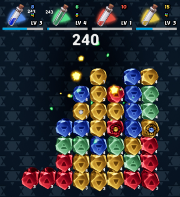 Alchematch Game (WIP) The task:Mobile match game. Personal project, 100% responsible for all the art (the flasks are modified assets), design, animations, coding etc.